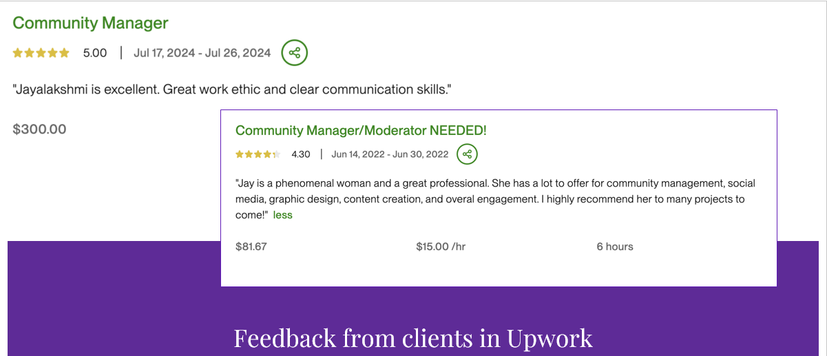 - 4-star rated freelancer on Upwork with expertise in community building and customer engagement.